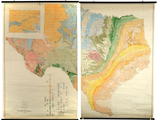 This colossal geological map of the state measures approximately 8.5 feet wide by 6.5 tall if joined together. It was prepared by N.H. Darton, L.W. Stephenson, and Julia Gardner and edited by George Stose. Geological data was compiled over an 11-year period (1924-35) and provided by the University of Texas, the geologists of Texas, U.S. Geological Survey, and various oil companies. Texas led the country in oil production at this time, so it is no surprise that the private sector had some influence on this compilation. The resulting map presents incredible visual detail throughout using a combination of color and pattern, identifying 104 unique types on the map including sandstone, shale, limestone, and granite to name a few. These types are grouped chronologically, spanning from the earliest Precambrian period to the Pleistocene (Ice Age) period. The base map by A.F. Hassan, updated to 1930, provides additional detail including railroads, cities and towns, rivers, parks, and more. An inset at top shows the northern panhandle on the same scale. Printed on four sheets and joined into two vertical sections, with each section linen-backed and mounted on rollers. While we found a few dealer listings and a number of institutional holdings per OCLC, this map has never before appeared at auction.