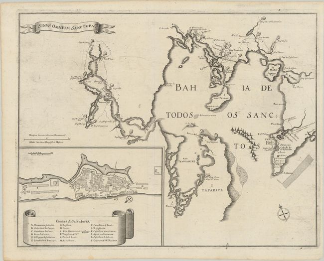 This impressive copper engraving covers Todos os Santos Bay (All Saints Bay) in northeastern Brazil. The map depicts a large fleet of Dutch ships entering the bay and locates several battle sites. The map illustrates the region during the time when the Dutch were attempting to gain control of the Portuguese colonies and lucrative sugar trade in Brazil. In 1624 the Dutch captured and sacked the Salvador da Bahia, and held it along with other northeast ports until it was retaken by a Spanish-Portuguese fleet. The city then played a strategically vital role in the Portuguese-Brazilian resistance against the Dutch in the 1630s. At bottom left, there is large inset plan of Civitas S. Salvatoris (San Salvador) with a lettered key identifying important locations. Both the map and inset map are adorned with ribbon-style title cartouches and compass roses.