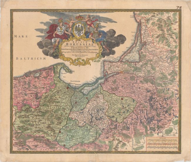 This is a very beautiful map due to the highly decorative title cartouche filling the Baltic Sea. The map covers the northern portion of Poland (Gdansk south to Torun) and the Baltic coast, Konigsburg (Kaliningrad) into Lithuania. It is highly detailed throughout with roads, cities, and towns. The title cartouche features a god and goddess of war and two putti flanking the coat of arms of the Kingdom of Prussia.
