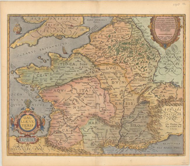 A lovely map of France during Roman times based on ancient geographical sources including Strabo, Plinius, Virgilius, Ovidius and Caesar. The map is filled with detail and ancient place names. Two ships sail in the stipple engraved oceans and the map is decorated with two fine cartouches. This is the second state with Marseille now appearing as Massilia rather than Marsilia and Sequani added northwest of the Jura mountain range. Latin text on verso.