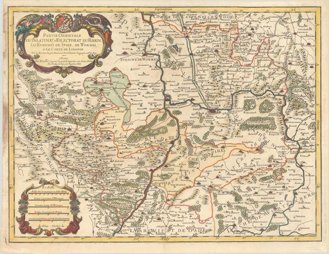 This map centers on Manheim and the intersection of the Rhine and Neckar Rivers. Towns, political boundaries, rivers, mountains, and forests are all graphically depicted. Two large cartouches adorn the map and feature bunches of grapes.