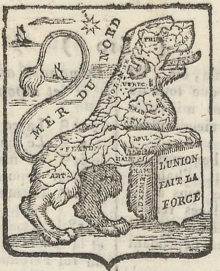 This is a four-page publication of the Journal De La Belgique from June 15, 1815, in French, giving news from around Europe. The journal used a miniature version of the Leo Belgicus map as their logo. The Leo Belgicus, in which the Low Countries were depicted in the form of a lion, was one of the highpoints in the Golden Age of mapmaking. This version is based on the original 1538 Aitsinger form with the lion standing facing right with a paw raised and holding a shield. The shield bears the motto, L'Union Fait la Force, which translates as "Unity Gives Strength." Two tax stamps appear to the right of the title. The Leo Belgicus measures 1.4 x 1.7".