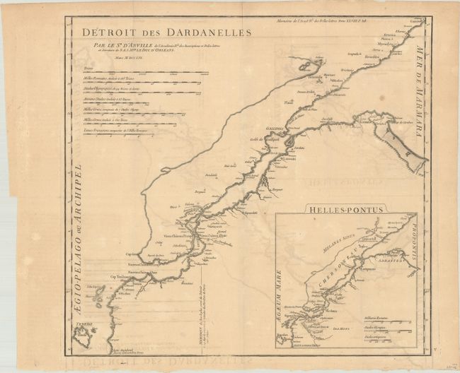 This map depicts the strait of the Dardanelles between the Aegean Sea and the Marmara Sea. Villages, towns and cities are identified along the strait along with several ruins. The new castles of Europe and Asia are depicted at the entrance to the Aegean, while the old castles of Europe and Asia are located within the Dardanelles. An inset at bottom right features the same geography with ancient names.