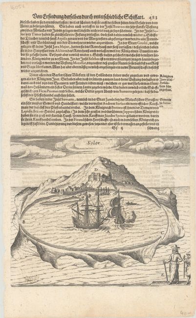 D. [Portrait of the Island Solar with Its Harbour] Solor, from Grands Voyages, Part XI, circa 1620 (7.3 x 6.1"). This bird's-eye view illustrates the volcanic island of Solor in the Lesser Sunda Islands. It depicts the harbor as a large circle enclosed by rocks and mountains, with an exit that is allegedly hard to locate. A chalk-and-stone fortress is prominently identified on land, and a couple figures in local dress appear in the foreground at bottom right. On a sheet of German text measuring 7.9 x 12.8". Condition: There is a small paper flaw in the engraved image at top right and a small chip in the right blank margin. (B+)