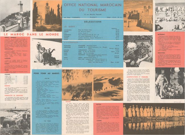 This is a superb lot of three French tourist maps of Morocco, issued by the "Office National Marocain du Tourisme." The maps highlight the key cities, roads, and railroads to assist travelers in planning their trip. Two of the maps also locate hotels, lakes, artificial lakes, palm groves, cedar forests, winter sports and beaches. Each map is surrounded by lovely vignettes created by French painters that showcase the vibrant people, places, and culture to be found in Morocco.