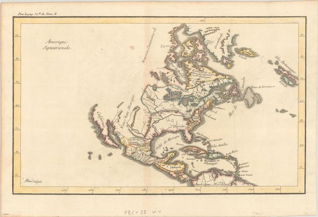 This unusual and scarce map of North America was engraved by Filloeul (Pierre?) as indicated in the lower left corner of the map. It shows the English colonies confined to a narrow strip along the Atlantic Ocean with the Appalachian mountains nearly surrounding Virginia. To its west is a large Floride with the Mississippi River drawn too far to the west. Beyond the Mississippi River is Spanish-controlled New Mexico and a peninsular California. The Pacific Northwest is virtually blank. "Pour la pag. 370 du Tome II" is noted above the top left border.