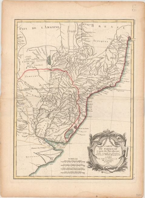 A detailed map of present-day Uruguay and parts of Paraguay and Brazil. There is extensive detail of the river systems in the region and numerous cities are also identified. The mythical Laguna de los Xareyes is also shown. Adorned with a decorative rococo cartouche.