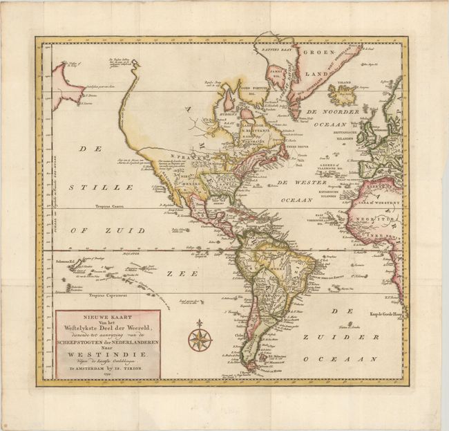 An attractive map of the Americas that also includes a good bit of western Europe and Africa. The map displays a speculative River of the West through North America, beginning at the Great Lakes and emptying into the Pacific at about 50° N. latitude. The entire western part of North America is virtually blank. The northwest coastline is delineated by a dotted line terminating with a notation concerning the Russian explorations in 1743 in the region of Alaska, with a nearby coast of Asia. A simple title cartouche and nice compass rose adorn the map.