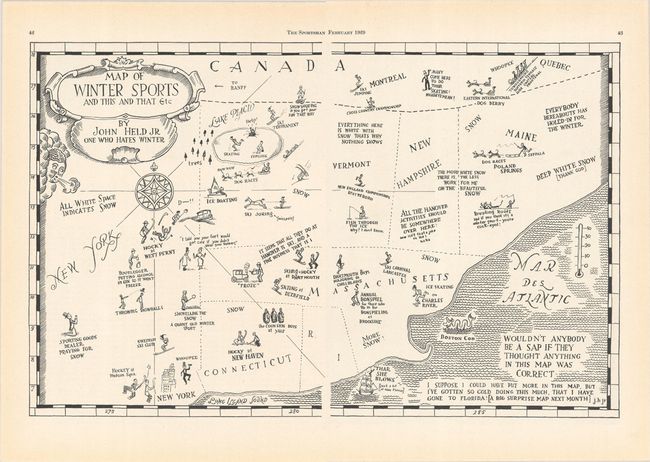 This cheeky map touts winter sports in New England and was created by John Held Jr., a self-professed man "who hates winter." The sizes and shapes of the states are very loosely drawn, so that attention is focused instead on images of various winter activities, such as dog sledding, ice skating, curling, skiing, ice hockey, snowshoeing, tobogganing, and ice fishing. This map was created to accompany an article on the Dartmouth Outing Club, part of which appears on verso of the western sheet. Dartmouth students are featured in the map skiing, playing hockey, and suffering from chilblains. One of Dartmouth's rivals, Yale, is shown as "coon skin boys." This map was published in the February 1929 issue of The Sportsman and includes a teaser for another of Held's maps to be published the following month. See lot 238 for the "surprise map." On verso of the eastern sheet is a photographic image of Long Key, Florida (hint, hint!).