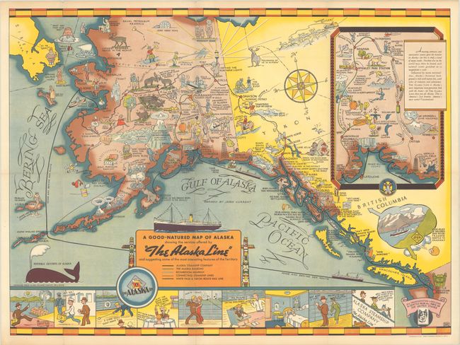 This pictorial tourist map was published by the Alaska Steamship Company to encourage travel from the continental US to Alaska. Steamship routes are shown originating in Seattle, where it is noted that "all transportation lines lead to Seattle from all parts of the United States." Other forms of transportation are identified in Alaska and neighboring Yukon Territory, such as railroads and highways. The map illustrates "some of the most interesting features of the Territory" and popular activities, including Mt. McKinley, active volcanoes, gold dredging, the northern lights, dog sledding, and various types of wildlife depicted as cartoonish rather than dangerous. A large inset in Canada focuses on the region between Anchorage and Fairbanks and includes a note touting Alaska's "natural scenic grandeur" and history "rich with native lore, with tales of romance and adventure." A comic strip at bottom shows how comfortable and luxurious it is to travel via steamship, and a note in British Columbia reassures the seasick traveler of low winds and smooth travel by ship between Seattle and Skagway.