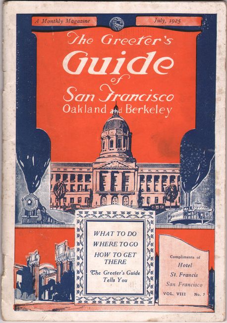 B. San Francisco, the City of Enchantment [in] The Greeter's Guide of San Francisco Oakland and Berkeley, by Hotel St. Francis, published 1925, black & white (9.6 x 6.5"). This 64-page tourist guide highlights "What to do, Where to go, and How to get there" in the Bay Area. The guide contains a simple centerfold map of San Francisco extending from the Railroad Depot west to Golden Gate Park and the Presido. Interspersed within the text are numerous advertisements along with single-page maps of Oakland, the Bay Region, and "Automobile Roads in California." Condition: Contents are mostly clean, paper wrappers are lightly foxed.
