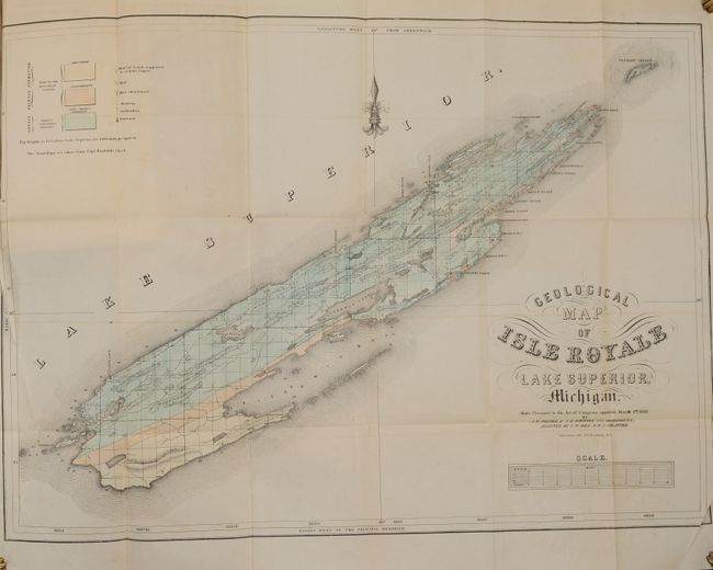 B. Geological Map of Isle Royale Lake Superior (21 x 14.7"). This is an early edition of Charles T. Jackson's important geological map that locates sandstone, conglomerate and trap formations and delineates copper veins as well as copper and silver mines. A scale below title converts chains to miles. Fancy title lettering.