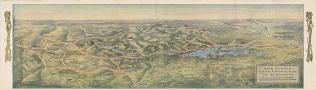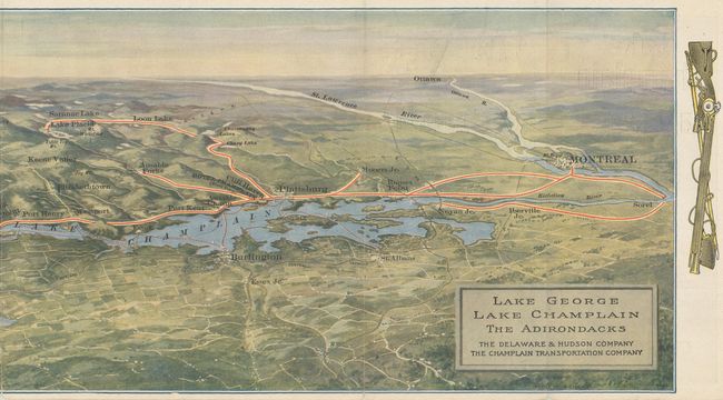 This attractive bird's-eye view of upstate New York extends from Albany north to Montreal and prominently depicts the lines of the Delaware & Hudson Railway weaving through the region in red overprinting. The view is copyrighted in 1911 by A.A. Heard. The verso contains smaller maps of each lake, photographic illustrations, transportation schedules, and related text. Self-folding into pictorial wrappers with an image of a steamship (4.1 x 9.2").