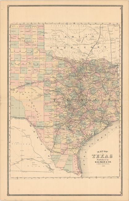 This large map is a scarce issue of Texas by the little-known H.R. Page & Co. firm of Chicago. County development is shown in attractive full hand color, which is uncommon for this late date. The map locates cities, towns, rivers, lakes, and an extensive railroad network. Unlike earlier editions, this map does not contain an inset of Presidio and El Paso, but instead oddly squeezes these counties in upside down in the interior of Mexico without hand coloring.