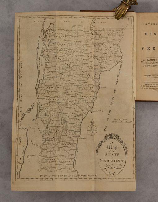 The map is still bound into the front of Samuel Williams' The Natural and Civil History of Vermont. The 416 pages of text includes chapters on the state's physical description, native Indians, early English settlements, customs, laws, religion and more. Includes a 5-page list of subscribers at the rear of the volume. Octavo, hardbound in full leather with title label on spine.