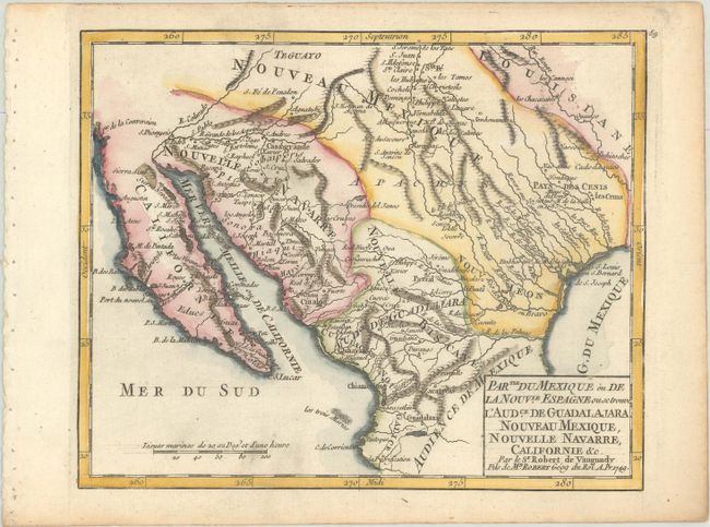 This small and uncommon map details the region from Texas through northern Mexico and California. In Texas, La Salle's settlement from 1685 in noted. The map is filled with place names and Indian villages.