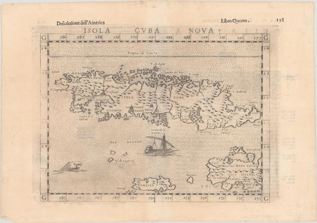 This early, detailed map of Cuba is based on the work of Gastaldi. Cuba is correctly shown as a very mountainous island, although the overall shape and orientation is incorrect. Trinidad (La Trinitad) appears in its correct position on the southern coast, but the other cities are less identifiable. The map also includes Jamaica, the Cayman Islands and part of Hispaniola. This is the later edition with the decorative elements added. Italian text on verso.