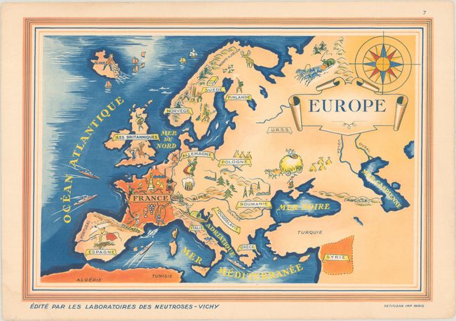 This map was part of a series of 8 pictorial maps of French possessions around the world, published by the pharmaceutical company Vichy Laboratories to promote their products "Neutroses-Vichy" and "Vegerenyl," which are advertised on verso. Neutroses-Vichy was an antacid created to treat upset stomach, and Vegerenyl was purported to treat ailments affecting the kidney and bladder; however the Vegerenyl ad on verso is partially obscured by an ink stamp indicating that production of the product had been suspended. Printed by Petit Jean.