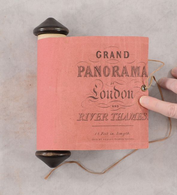 This unique panoramic view of London along the Thames River measures an astounding 18 feet in length. Engraved on wood with place names at the foot, the map begins at Western Stone Wharf and Victoria Tower to the Isle of Dogs, then "We now cross the River, and the View is taken on the opposite Shore" from Greenwich Reach to the Royal Victualling Office. Composed of seven joined sheets that are rolled onto a wooden dowel with the original publisher's red paper cover with printed title affixed to the verso of the beginning of the scroll, with original string tie. Sold by Azulay, Thames Tunnel.