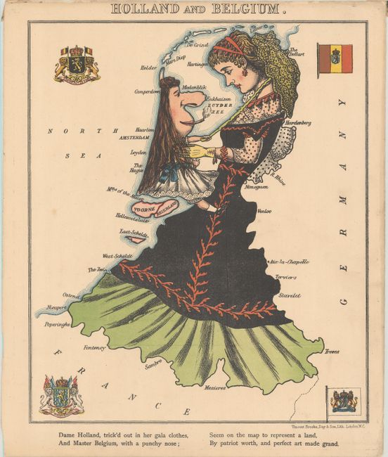Satirical political maps appear throughout cartographic history and gained popularity in the latter part of the nineteenth century. This is one in a series of twelve maps of Europe that depicted the political geography in human form. The idea for the maps originated from a young girl's drawings made to amuse her sick brother. Aleph, the pseudonym for William Harvey, compiled the maps and wrote the verses that accompany them. According to his introduction, the illustrations were meant as a humorous, educational aid in the study of geography, rather than the political satire they became. Harvey's publication first appeared in 1869, published by Hodder & Stoughton with the maps printed by the firm of Vincent, Brooks, Day & Son. This rare humorous chromolithograph of Holland and Belgium depicts Dame Holland holding Master Belgium in her arms. Master Belgium sports long hair and a dress, while smoking a cigar. Below the map is the verse: