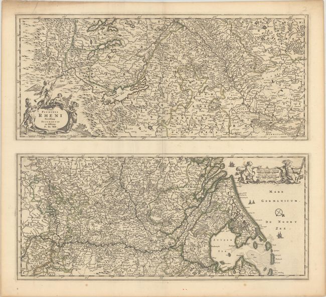 Two maps one sheet, one above the other, charting the course of the Rhine River. Beginning on the top map, from its spring at the Bodensee in Switzerland, the river flows through the eastern part of Germany and transitions to the bottom map to show its course through western Germany, the Netherlands and into the North Sea. The upper map has a decorative title cartouche attended by the trumpeting Angel of Fame, a Roman soldier, and a pair of devotees of Bacchus. The lower map is decorated with mer-people and sailing ships.