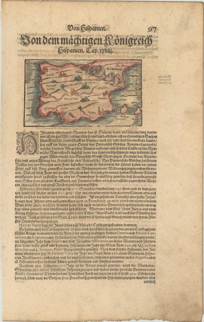 Early woodcut map of Spain and Portugal locating major cities. On a sheet of German text measuring 9.3 x 14.3". On verso are the coats-of-arms for 8 regions in Spain.
