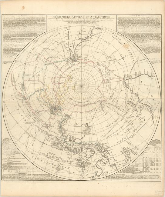 This rare, separately published map shows the most recent discoveries in the southern hemisphere, including Captain Cook's second voyage in search of Terra Australis. This example includes outline coloring to denote Cook's first voyage in green, his second voyage in red, and the antipode of the European continent in yellow superimposed over the South Pacific Ocean. This is the third state of this map, which was first published in 1773, and is significant for the numerous updates near the South Pole. In addition to the tracks of Cook's second voyage, these updates include more sightings of "moving ice" in a ring-shape around the South Pole, new information based on Yves-Joseph de Kerguelen's second voyage, and updates to islands in the South Pacific. Kerguelen's discovery of B de l'Oiseau, part of what is now known as the Kerguelen Islands, has been added along with a notation regarding his voyage. Another interesting addition to this third state is a long note at bottom regarding Cook's second voyage and the insights gained from it. Cook's exploration largely dispelled the myth of Terre Australe in favor of the existence of a Terre haute (tall land) that was iced over and uninhabitable. The note also explains that Europe's antipode lies largely over the ocean, with the exception of Spain, which corresponds with New Zealand. The map is surrounded by additional notes and a table of longitude and latitude. Engraved by E. Dussy.
