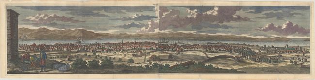 Superb panoramic view of Chios viewed across the city to the Turkish mainland in the background. Cornelius van Bruyn (1652-1726) was a painter who traveled through the Holy Land and other portions of Asia. De Bruyn had to disguise his activities because this was a repressive period during the Ottoman rule when foreigners were regarded with suspicion and the making of "graven images" was prohibited. De Bruyn avoided detection by pretending to be picnicking with two Franciscan monks who stood guard while he made his drawings. His works are particularly historically valuable because of their accuracy. Printed on two joined sheets as issued.