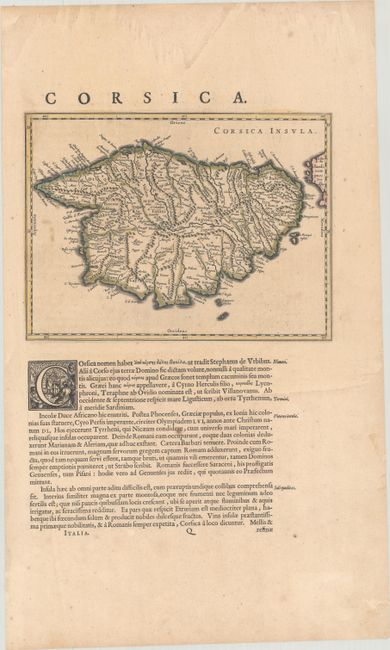 This copper engraved map of the island is oriented with the north to the left. It is fully engraved with detail of rivers, mountains, cities, and towns. On a full sheet of Latin text (11.9 x 20.0") with a large decorative capital. This map appeared in a Latin edition of Theatrum Orbis Terrarum published between 1635-55.