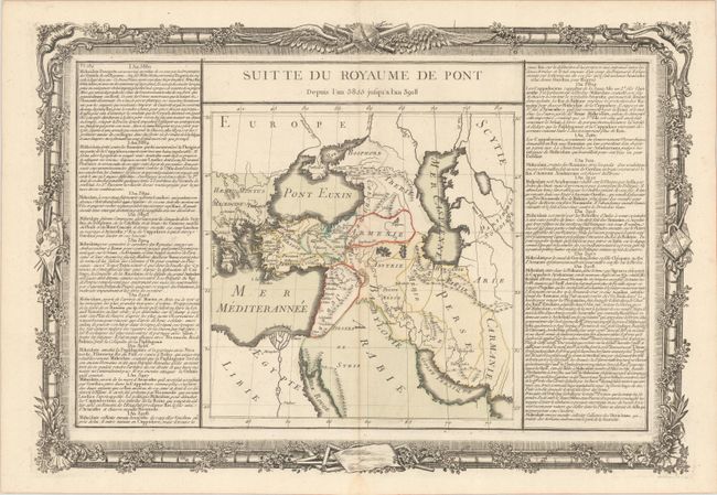 A. Suitte du Royaume de Pont Depuis l'An 3855 Jusqu'a l'An 3918, by Brion de la Tour/Desnos, circa 1766 (20.5 x 14.1"). This handsome historical map covers from Greece to Persia, extending to include the Nile Delta, part of the Arabian Peninsula, and the Black and Caspian seas. It includes several ancient place names and political divisions. There is no sign of Crete or Cyprus. The map is flanked by French text discussing the history of the region in the 39th and 40th centuries BCE. It is surrounded by an ornate frame-style border that was printed from a separate plate. Condition: A crisp impression with contemporary color on watermarked paper with minor color offsetting along the centerfold, and a small damp stain confined to the bottom blank margin.