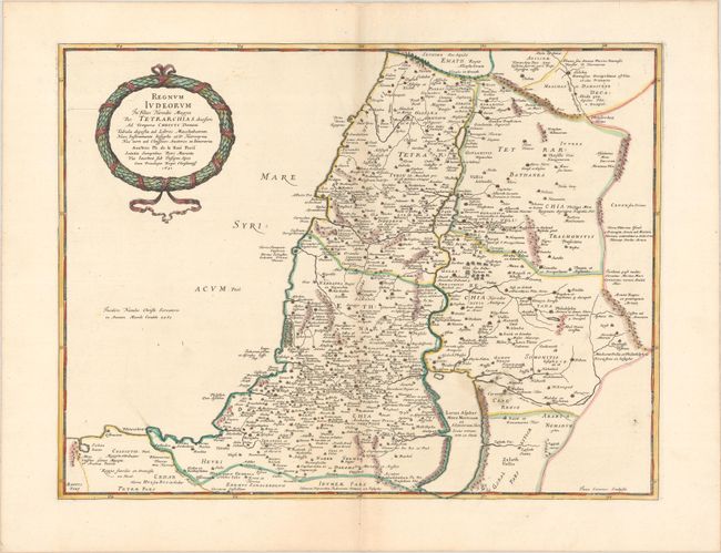 Handsome and uncommon map of the Kingdom of Judea with good detail throughout. It shows the extent of Palestine during the reign of the sons of Herod the Great up to Christ's time. Engraved by Jean Sommer.