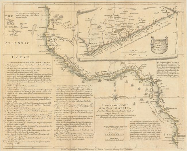 This attractive map of the central western coast of Africa shows the various colonial possessions and notes the slave trade in the region. Detail is confined to the coast, with numerous place names, currents, navigational hazards, and tiny sailing ships. A large scroll-style inset depicts "A Map of the Gold Coast on a larger Scale." The map includes extensive notations on the various possessions as well as about the Gold Coast. Published in Postlethwayte's Universal Dictionary of Trade and Commerce.