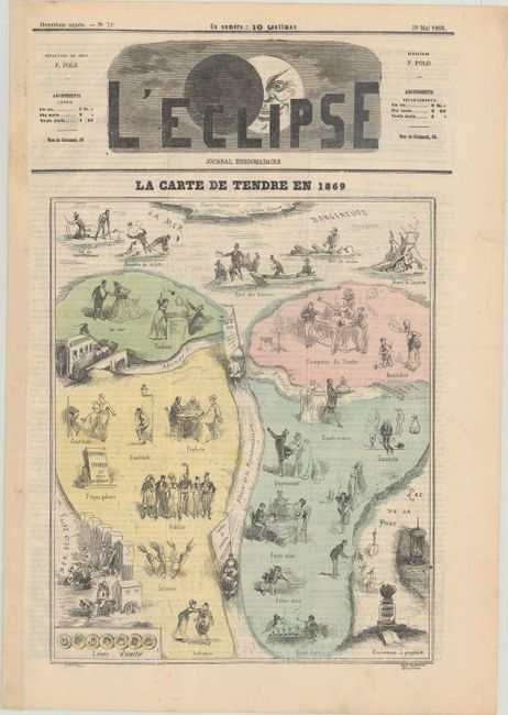 This satirical map of "tenderness" was created by Paul Hadol, a French illustrator and caricaturist, and was based on Madeleine de Scudery's map of the same name published in her historical novel, Clélie, in 1653. Hadol updated the map to reflect French society at the end of the Second Empire, creating a heart-shaped land bisected by rivers into four quadrants. The map is accompanied by an explanatory article on verso, written by Eugene Vermersch, a poet and social commentator. The map and commentary portray a gloomy and critical view of love and matters of the heart, shrouded in misogyny. Words and phrases related to relationships fill the heart, with each one illustrated by a small vignette. While the words on the map elicit positive connotations, the imagery depicts the opposite (and is typically perpetrated by a woman). "Tenderness" is illustrated by a woman throwing a meal at her partner; "Fidelity" is a woman walking arm in arm with a row of foreign men; "Integrity" is a woman cheating at a card game; and "Gratitude" is a woman literally kicking a man out of her home after he has given her a bag of money. Of course men aren't completely innocent, engaging in an elaborate and over-indulgent feast with a woman rather than the "Little Cares," and visiting a brothel disguised as a "Bar of Tenderness." However the map is clearly drawn from a man's point of view, with men attempting to reach the "Island of the Good Woman" while encountering every obstacle in the "Dangerous Sea," including the Bailiff's Reef, the Bank of Misery, the Reefs of Suicide, and the Islet of Softening (becoming dimwitted). Clearly finding a good woman was unattainable, considering that the "Island of the Good Woman" was considered Terres Inconnues or "Land Unknown."