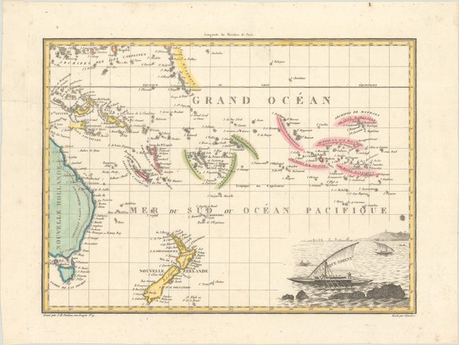 This nicely engraved map covers from the Carolines south to New Zealand and from New Guinea and eastern Australia east to Pitcairn Island. The coastlines of both New Guinea and New Zealand are left incomplete. Numerous small islands are named in the region's various archipelagos. There is a decorative title cartouche at bottom right that features native sailing vessels, with the title appearing on a sail. Prepared by Giraldon and engraved by J.B. Tardieu.