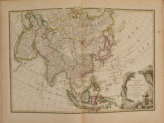 The second atlas is comprised of 20 maps of the ancient world, including the eastern hemisphere, Egypt, a 4-sheet map of the ancient empires, a 2-sheet map of Italy, Greece, Spain, France, Britain, Balkans, Germany, a 4-sheet map of the Roman Empire, and a 2-sheet map of the Holy Land. Also included in this volume are separate allegorical title pages for each atlas, an engraving with several wind roses, a 49-page work on the history of the world titled Tableaux Historiques et Chronologiques des Principales Revolutions Arrivees dans quelques Pays de l'Asie, de l'Afrique & de l'Europe, Depuis les Premiers Empires Connus jusqu'au Moyen Age, and a 20-page table listing ancient names and the corresponding modern name.