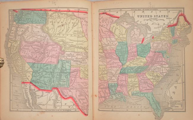 This is the very desirable edition of this small atlas that contains pre-Civil War American state and territory maps. It includes maps of all the Americas, with specific focus on the U.S. states and territories, several interesting thematic world maps showing data like animal distribution, religions and climate. The map of the territories of Washington and Oregon extends to the Continental Divide. The map of Utah and New Mexico is nearly identical to Colton's important map of the territories. The first 30 pages of the book feature beautiful engravings of ships, animals, natural disasters, climates, and putti. The book contains two title pages, publishers' preface, table of contents, text and 53 maps, 239 pp. Hardbound in full red leather with gilt titling on front cover and spine; all edges gilt (AEG).