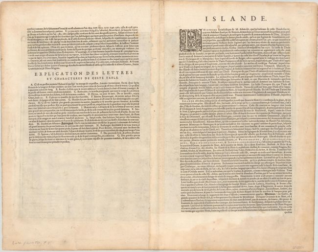 This is one of the most spectacular of all decorative maps, filling the Icelandic seas with a Boschian array of sea monsters. A lettered key on the verso gives descriptions of the creatures. Some of the beasts can be linked to a real sea creature, particularly whales and walruses, while others are wholly fantastic, such as the aquatic hyena (D) and seagoing cow (K). A Latin note near the coast explains a group of foxes holding each others tails suspended down a cliff as follows: Sly little foxes reaching for bird's nests to rob. The upper right corner accurately depicts polar bears gamboling and fighting on ice flows, while below them an expanse of driftwood makes its way to the northern coast. Driftwood was and still is an important natural resource in coastal Iceland after it floats down from Siberia. Ambergris is noted as well (O), with the description on the verso linking it to sperm whales. The interior of the island shows its mountainous topography, including Mt. Hekla in all its volcanic fury, spewing flames and rocks. Ortelius attributed the cartography to Andres Sorensen Vedel, a Danish historian, who acquired the information from a now lost map by Bishop Gudbrandur Thorlaksson. French text on verso.