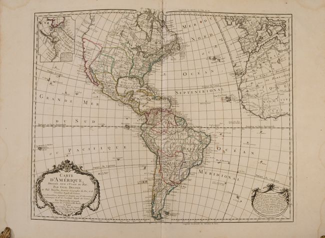 Carte d'Amerique, Dressee pour l'Usage du Roi. Par Guil. Delisle..., dated 1785 (23.6 x 18.8"). This is an updated edition of the important map that was first issued by Delisle in 1722. It was one of the most popular maps of the 18th Century. The new United States is noted extending to the Mississippi River, but the individual state boundaries are still shown on the Appalachian Mountains. The map shows a number of spurious mountains ranges in the West, going east to west and north to south, and sometimes doing both within the same range. This edition shows an inset of Cook's explorations in the Pacific Northwest, but without the related key from the earlier edition.
