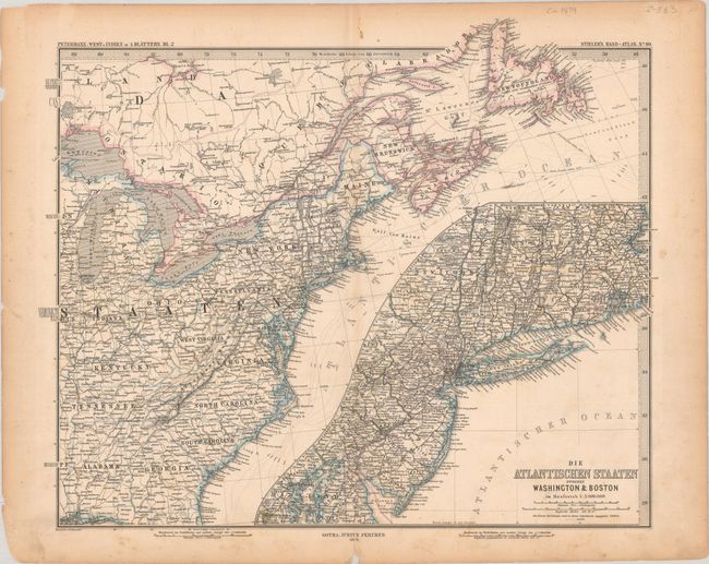 B. Die Atlantischen Staaten Zwischen Washington & Boston, by Augustus Herman Petermann, from Stieler's Hand-Atlas, dated 1879 (16.8 x 13.8"). This is the northeast sheet of Petermann's four-sheet map West-Indien, Central-Amerika bis zum Sudlichen Canada, published in Stieler's popular German atlas. It spans from Mobile north to Newfoundland. An inset, Die Atlantischen Staaten Zwischen Washington & Boston, provides rich detail of the region between D.C. and Boston. The map is dense with towns, cities, roads, rivers, and canals. Published by Justus Perthes. Reference: Rumsey #2761.088. Condition: On a lightly toned sheet with light scattered foxing and some chips and edge tears in the blank margins.