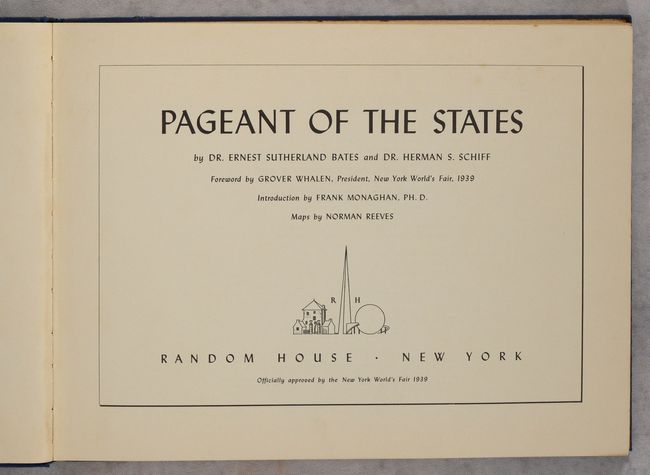 The atlas was created by Dr. Ernest Sutherland Bates and Dr. Herman S. Schiff. This version of the atlas was used as a promotional tool for the insurance company Royal Liverpool Groups, with a single-page advertisement at the front of the volume stating "it may truly be said that the romance of the States has been enhanced by the romance of Insurance." Hardbound in blue cloth with gilt title on the front cover.