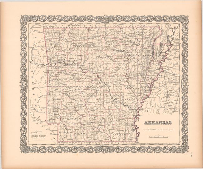 B. Arkansas, by Joseph Hutchins Colton, dated 1855, hand color (15.6 x 12.8"). This steel-engraved map depicts Arkansas and its counties. Towns and cities, post offices, and roads, are located. The proposed Cairo & Fulton, Ft. Smith, and Memphis & Little Rock railroads are noted, but no completed railways are shown. In addition to county divisions townships are delineated along with the principal meridian and baseline. The map is surrounded by Colton's typical strapwork border with unusual single color in outline. Condition: Contemporary outline color with marginal toning.