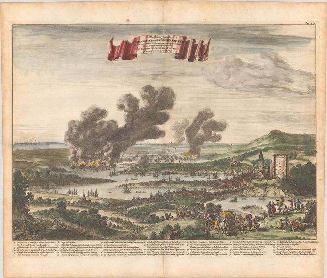 Lively copper engraving depicting one of the most famous battles in the war between the English and Dutch. The panorama depicts the region of Rochester and the entrance to the River Thames, where the Dutch fleet destroyed and captured numerous British ships, including the Royal Charles. The city of Rochester is well depicted; the river and bay are filled with burning ships. The hills overlooking the battle scene show numerous on-lookers and an army rushing into battle.