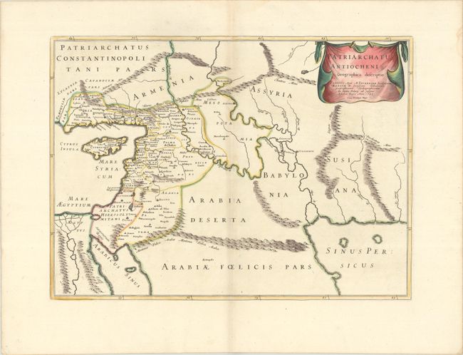 This map depicts the ancient Principality of Antioch along the eastern end of the Mediterranean, in parts of present-day Turkey and Syria. The map extends to the Persian Gulf and is filled with ancient place names, political boundaries, rivers, and exaggerated mountain ranges. Decorated with a drape-style title cartouche.