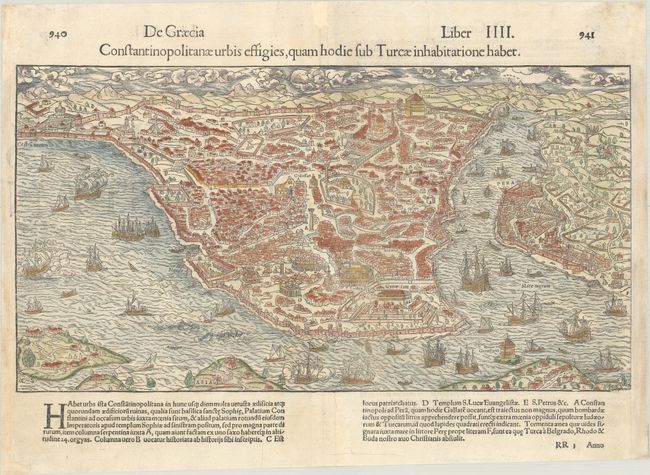 Detailed bird's-eye view of the Golden Horn of Constantinople. The city plan depicts the markets, homes, palaces and churches, including the famous Hagia Sophia, shown prior to the addition of the last two minarets in the late 16th century. On the Bosphorus Strait are dozens of large ships sailing out to sea. This is a very appealing medieval view with German text below and on verso.