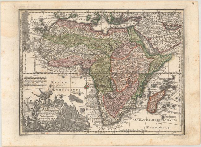 Handsome map displaying Seutter's strong style. The map is packed with detail - much of it fictitious. The Nile is shown not only originating in twin lakes, but also continuing further south nearly to the tip of the continent. A lake joins the Senegal and Niger Rivers. The large, cartouche is beautifully engraved and surrounded by natives and exotic animals including a large winged dragon. Engraved by Tobias Conrad Lotter.
