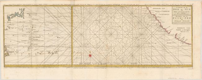 This version of the chart was issued in the French and Dutch editions of Anson's A Voyage Round the World. Joined on two sheets, it details the route of Spanish galleons between the Philippines and Acapulco. The tracks of British Navy Commodore George Anson and Spanish Nostra Seigniora de Cabadonga are shown. A somewhat speculative depiction of the islands of Japan is shown at top left. This chart appeared in Anson's account of his circumnavigation, compiled by Richard Walter and Benjamin Robbins, and first published in 1748.
