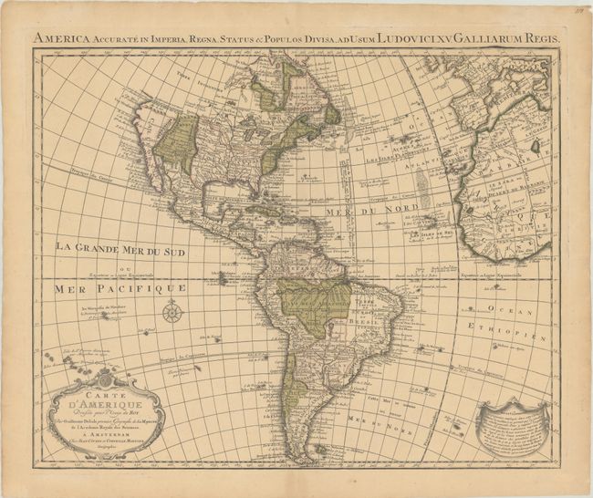 Guillaume Delisle's map of the Americas [1722] was one of the most popular maps of the 18th century with numerous editions published. Its various editions provide a great view of the evolving cartographic knowledge of the Americas throughout the eighteenth century. This is an interesting and rare variant between the fourth and fifth state described in Tooley, published in Amsterdam by Covens & Mortier with the addition of a Latin title at top: America Accurate in Imperia, Regna, Status & Populos Divisa... The detailed map of the Americas provides a great deal of information about the state of geographic knowledge in the New World in the early part of the century. In the fourth state as recorded in Tooley, the western coast of North America is blank above California. This example, however, includes a note in French text that reads, "La plupart placent ici le detroit d'Anian par le quel on pourroit passer de la Baye de Hudson dans la grande Mer du Sud" (Most place here the Strait of Anian, through which one could pass from Hudson's Bay into the great South Sea [Pacific Ocean]). French territory of Louisiane takes up the lion's share of North America at the expense of the British colonies. This political bias is due to Delisle's position as geographer to the King of France. South America is much better represented with good depiction of the river systems and locations of the Jesuit missions. According to Tooley, this 1739 issue is from a re-engraved plate which is basically unchanged from the 1722.
