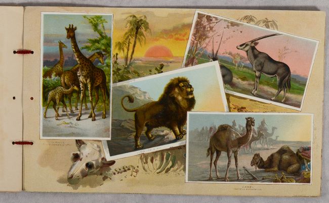 This unusual and attractive booklet focused on the animal kingdom was designed to advertise Arbuckle's Coffee. There are 12 sheets and wrappers held together by its original twisted string tie. Each sheet features four beautiful chromolithographic illustrations of mammals from across the globe including a leopard, puma, lynx, bighorn sheep, polar bear, aardvark, gorilla, and many more. Including the illustrations of lions on the front wrapper and a zebu and cacomixle on the rear wrapper, 51 different species are depicted in full color. Text on the facing page describes each animal and 2 pages at the end highlight the coffee industry. Lithographed by the Knapp Company.