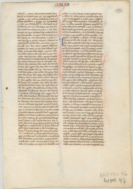 Fine vellum leaf from a French Bible. In Paris, the birth of the Bible as we know it took place around 1200, when for the first time it was bound into a single volume; the order and names of the books were standardized and the text was divided up into numbered chapters. The scribes employed headings at the top of each page and used blue and red initials to mark the beginning of each chapter. This leaf includes parts of chapters 12-18.