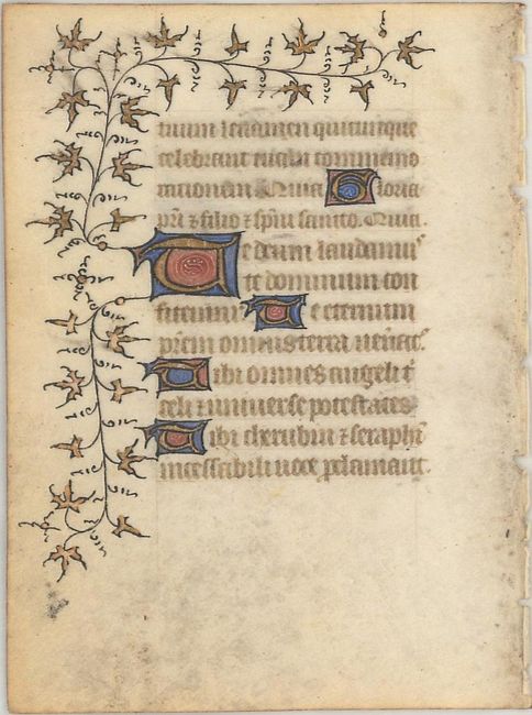 This is a lovely, tiny leaf from a Book of Hours created in Tours/Rouen around 1430. The book was so small, it must have been the property of a lady who carried it in her purse. This leaf includes 5 initials in red, blue and burnished gold, as well as vines and leaves in the margins. The text includes part of "Te Deum laudamus," a Latin hymn often sung on occasions of public rejoicing. Beginning with the large letter "T" on verso, the hymn translates as: